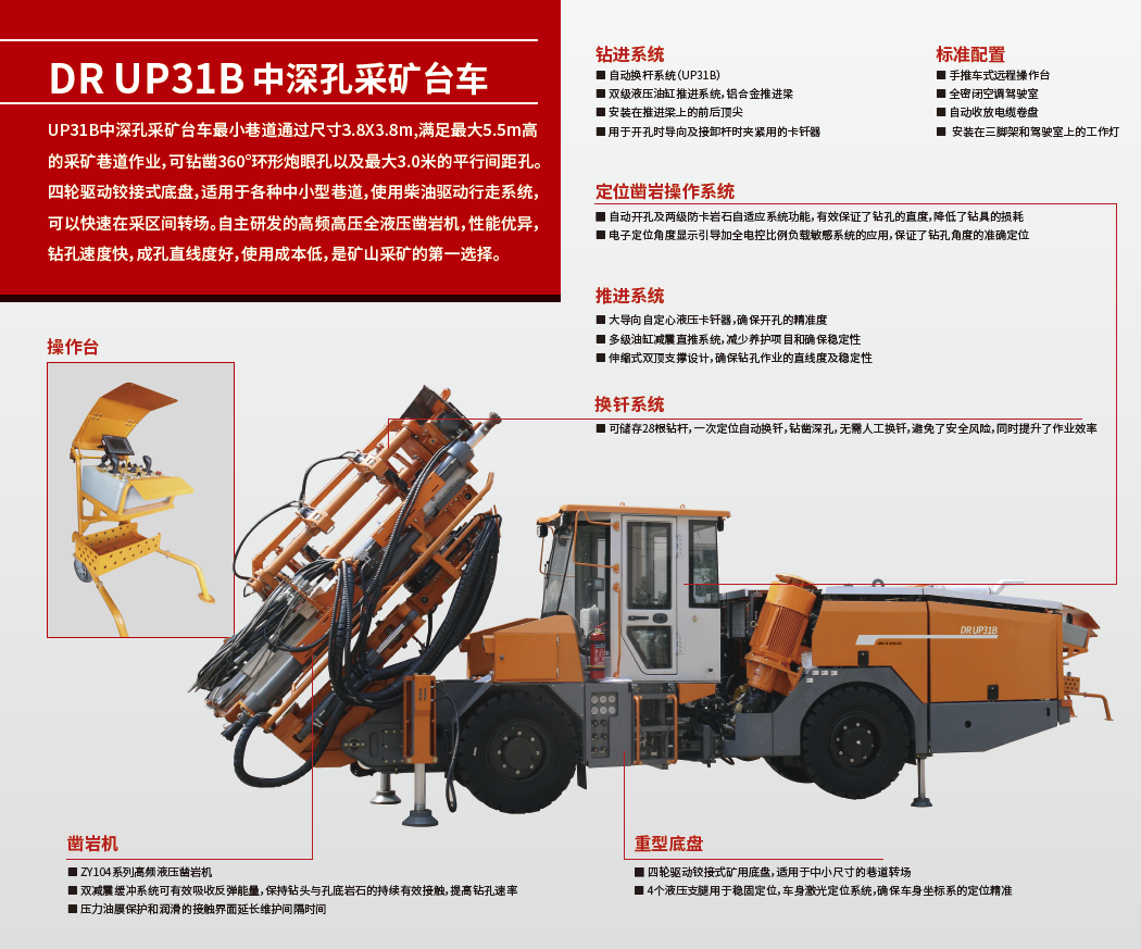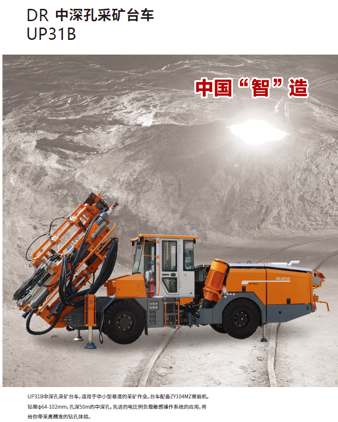 UP31B中深孔采礦臺(tái)車,適用于中小型巷道的采礦作業(yè)。臺(tái)車配備ZY104MZ鑿巖機(jī),鉆鑿φ64-102mm,孔深50m的中深孔,先進(jìn)的電比例負(fù)載敏感操作系統(tǒng)的應(yīng)用,將給你帶來(lái)高精準(zhǔn)的鉆孔體驗(yàn)。