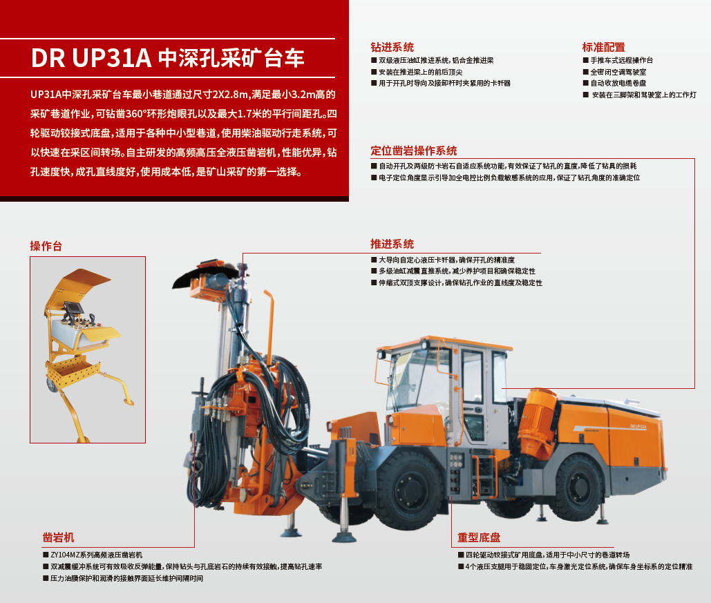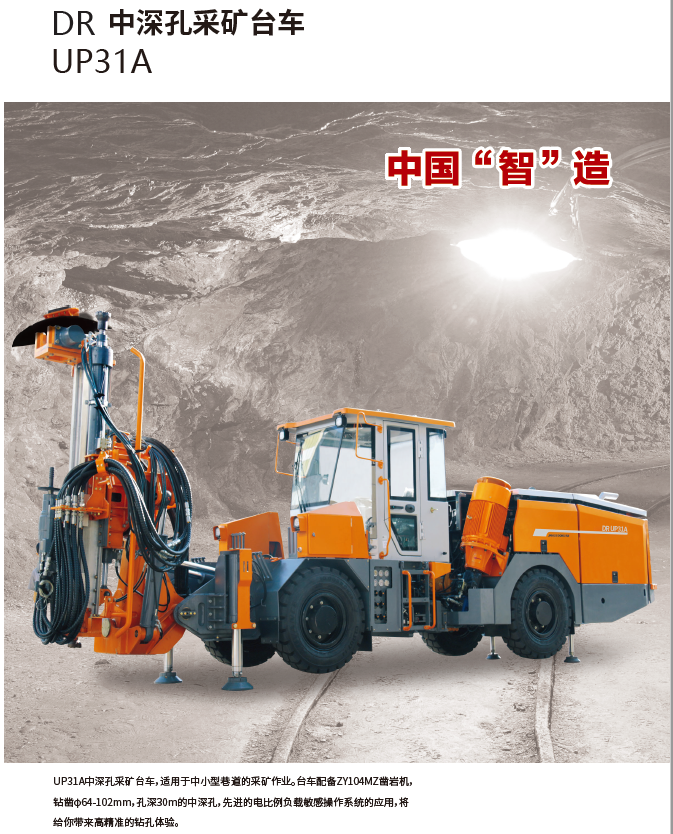 UP31A中深孔采礦臺車,適用于中小型巷道的采礦作業(yè)。臺車配備ZY104MZ鑿巖機,鉆鑿φ64-102mm,孔深42m的中深孔,先進的電比例負載敏感操作系統(tǒng)的應(yīng)用,將給你帶來高精準的鉆孔體驗。